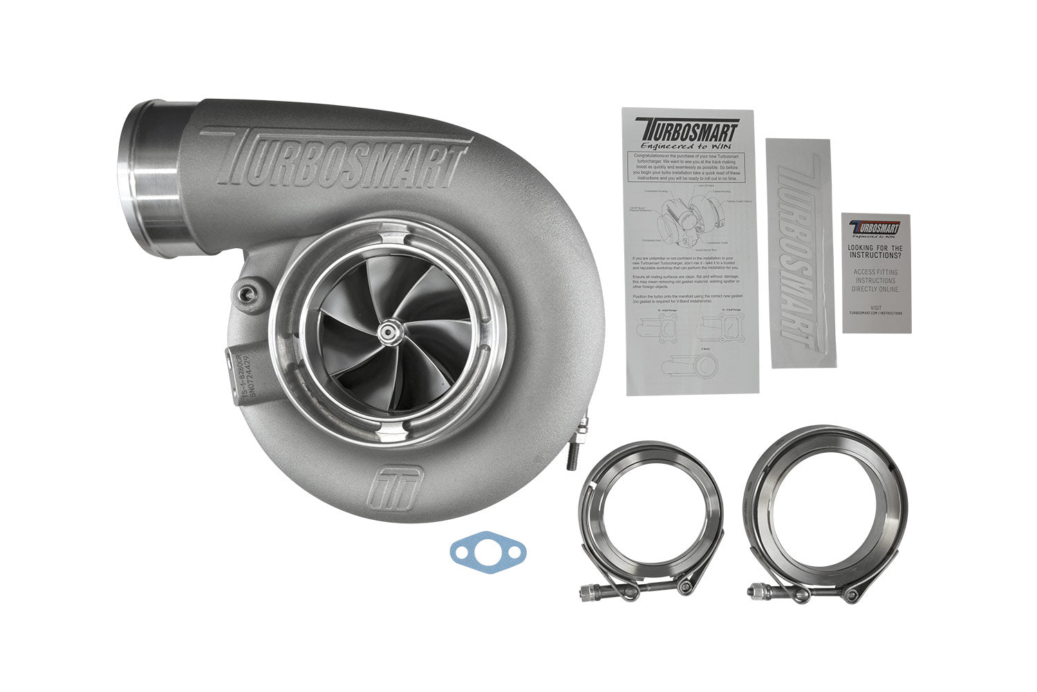 Every Turbosmart turbocharger comes standard with everything you need for installation, weld flanges, V-band clamps, gaskets, oil feed and drain fittings as well as water feed and return fittings are included.